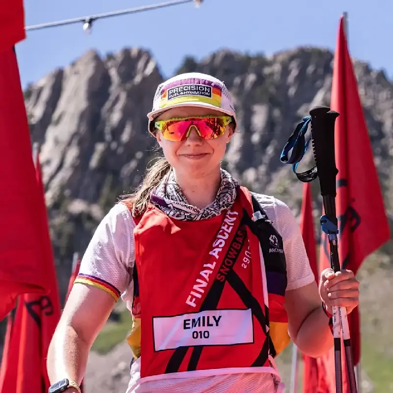 After weighing her empty soft flasks and wrappers to collect accurate data, Emily refilled both of her flasks at the bottom of the mountain before each ascent. This meant she could carry enough fluid with her to keep up with her total fluid losses (as measured in the Precision Performance Lab). As temperatures warmed throughout the day, so did her fluid demands. Emily wisely increased her fluid intake during these hikes and refilled again at the top aid station to sip alongside her real food on the way down.
