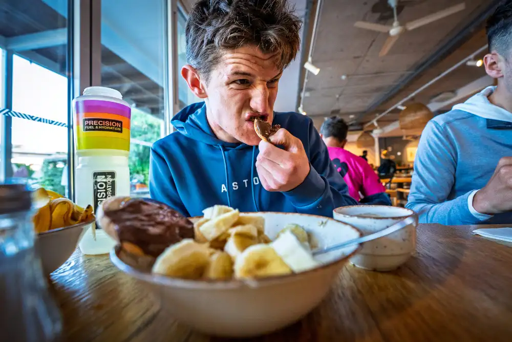 When it comes to pre-swim fueling, even sub-one hour swims use up a decent amount of stored glycogen as our bodies favour carbohydrates as a fuel source during exercise. You don’t need to overthink a carb load before every training session, but gradually increasing your carbohydrate intake 24 hours before a key session is smart.
