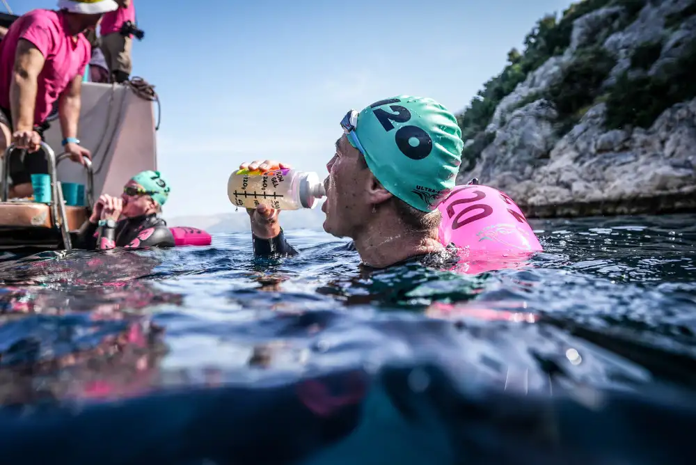 - If you’re fortunate enough to have a support kayak or paddleboarder, aim to take on small sips every 20–30 minutes. Try to avoid large gulps of water, as the horizontal body position means your digestive system must work harder in the absence of gravity’s help
